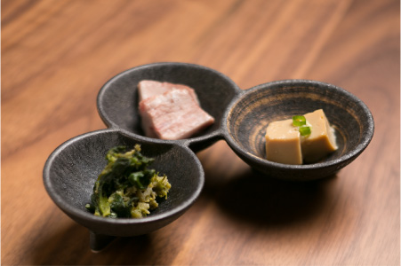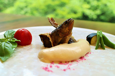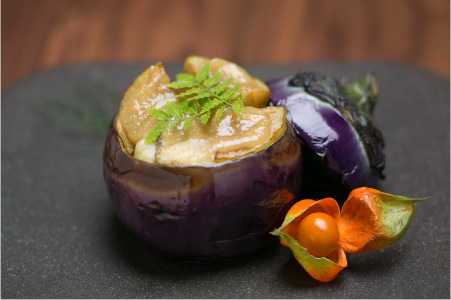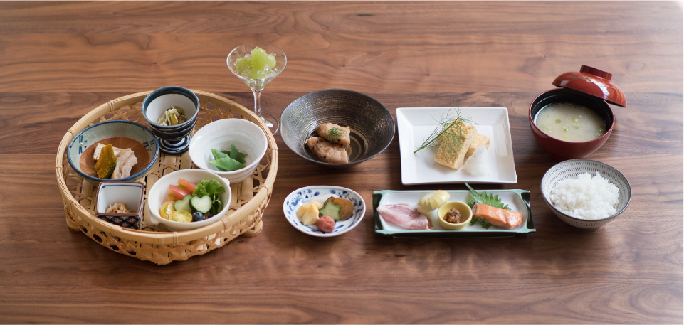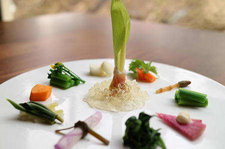 料理長の意向で食材は地元十日町、新潟県内産に限定し、自らも地元スタッフの案内で山へ入り山菜、果実や野草を収穫、この土地に根付いた保存食、発酵の技術を織り交ぜながら一皿一皿ご用意いたします。