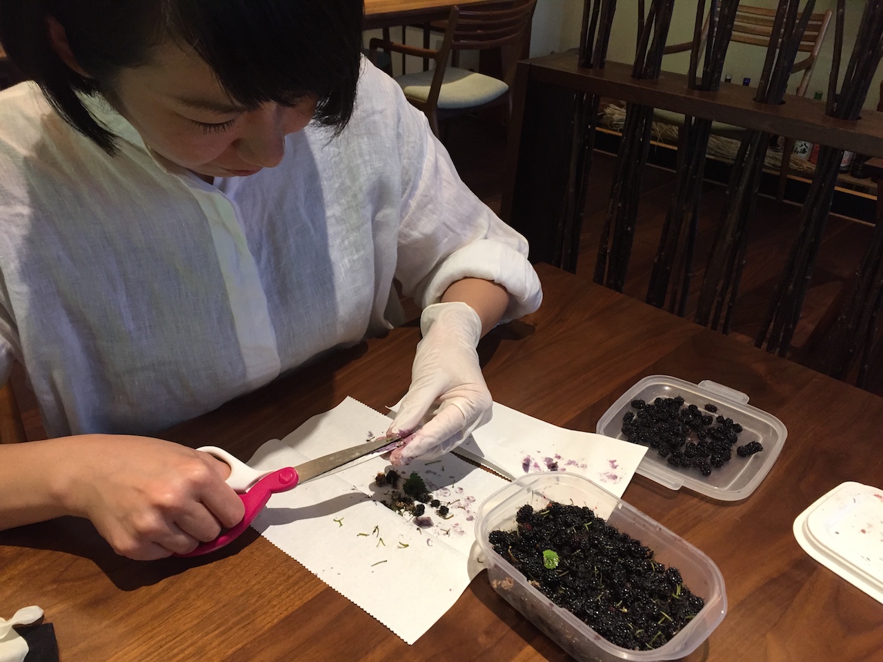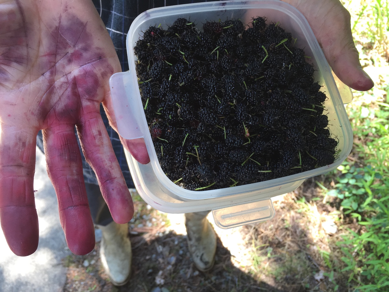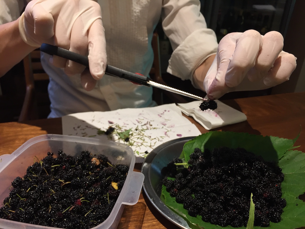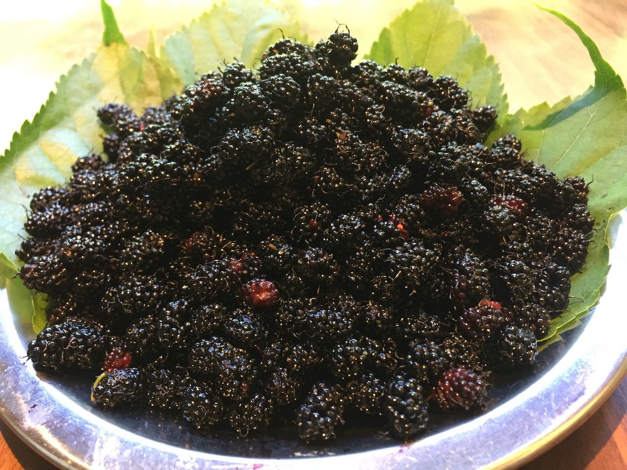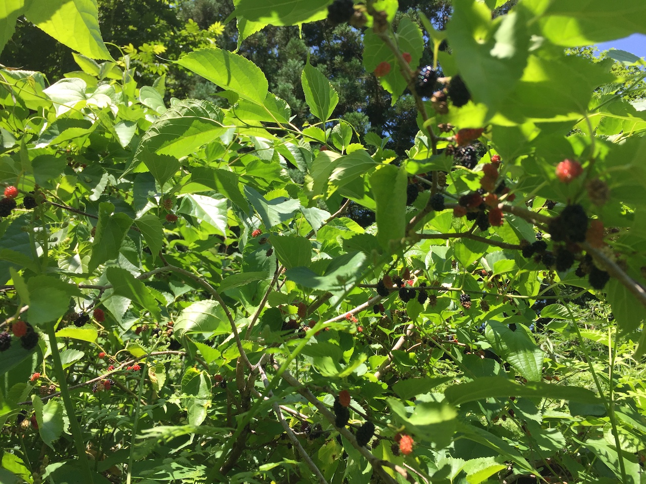 毛虫や蛇に気を付けながら桑の木の密集地に向かいます。そこには想像以上に黒く色付いた桑の実たちが!!