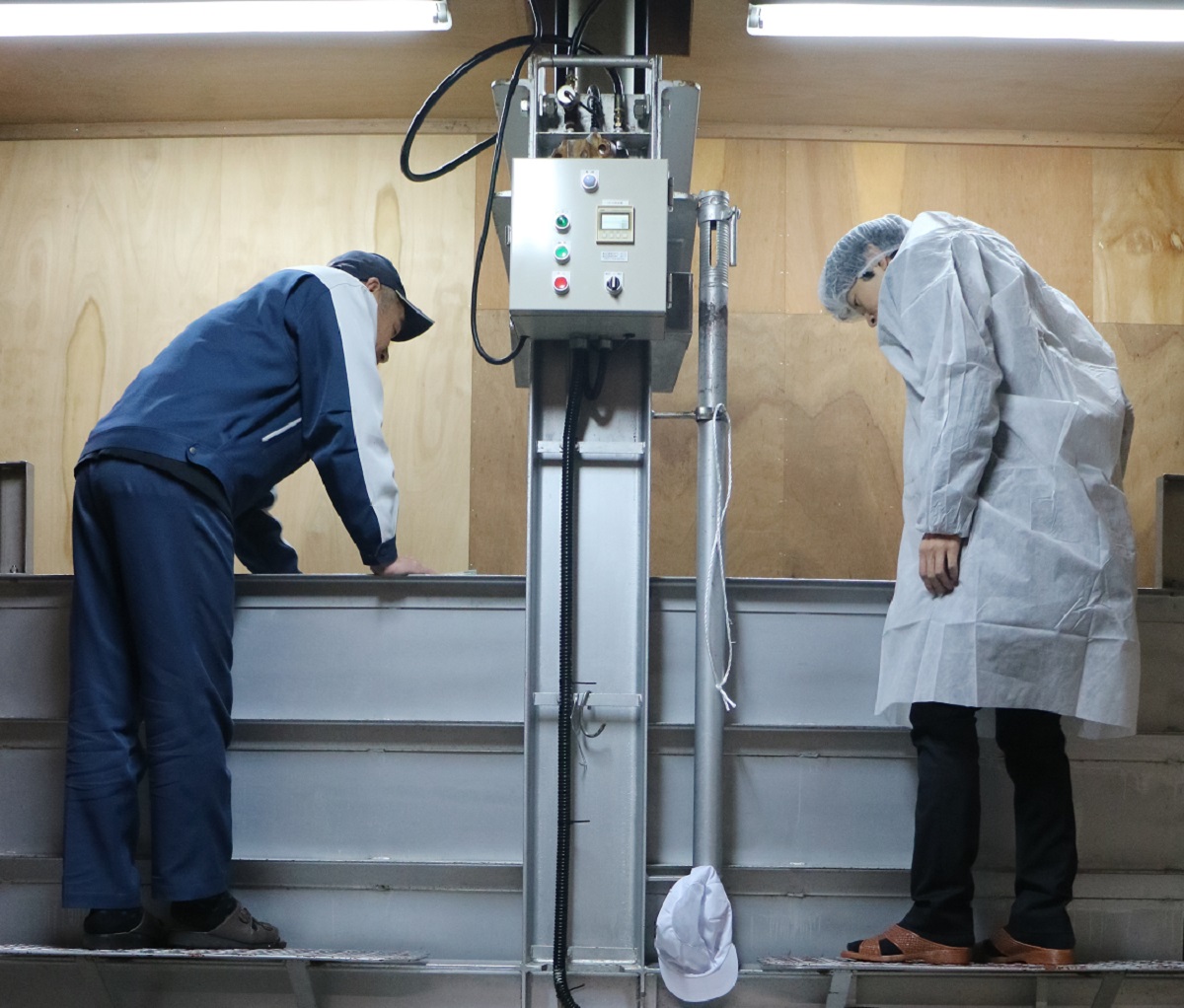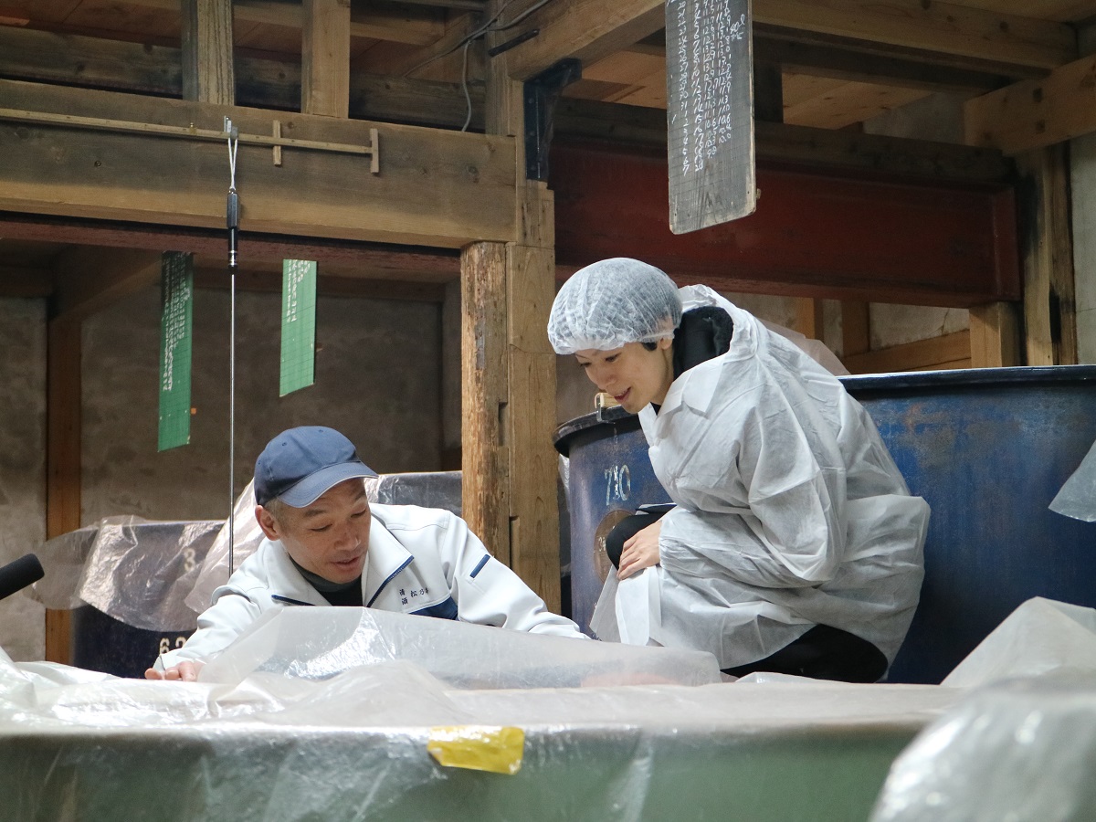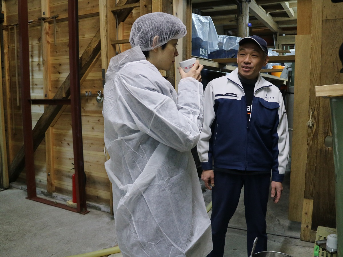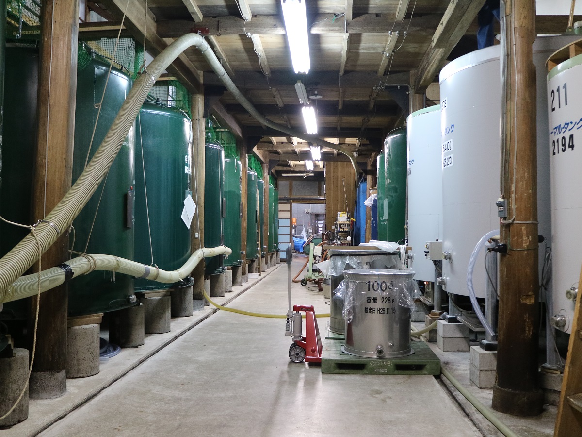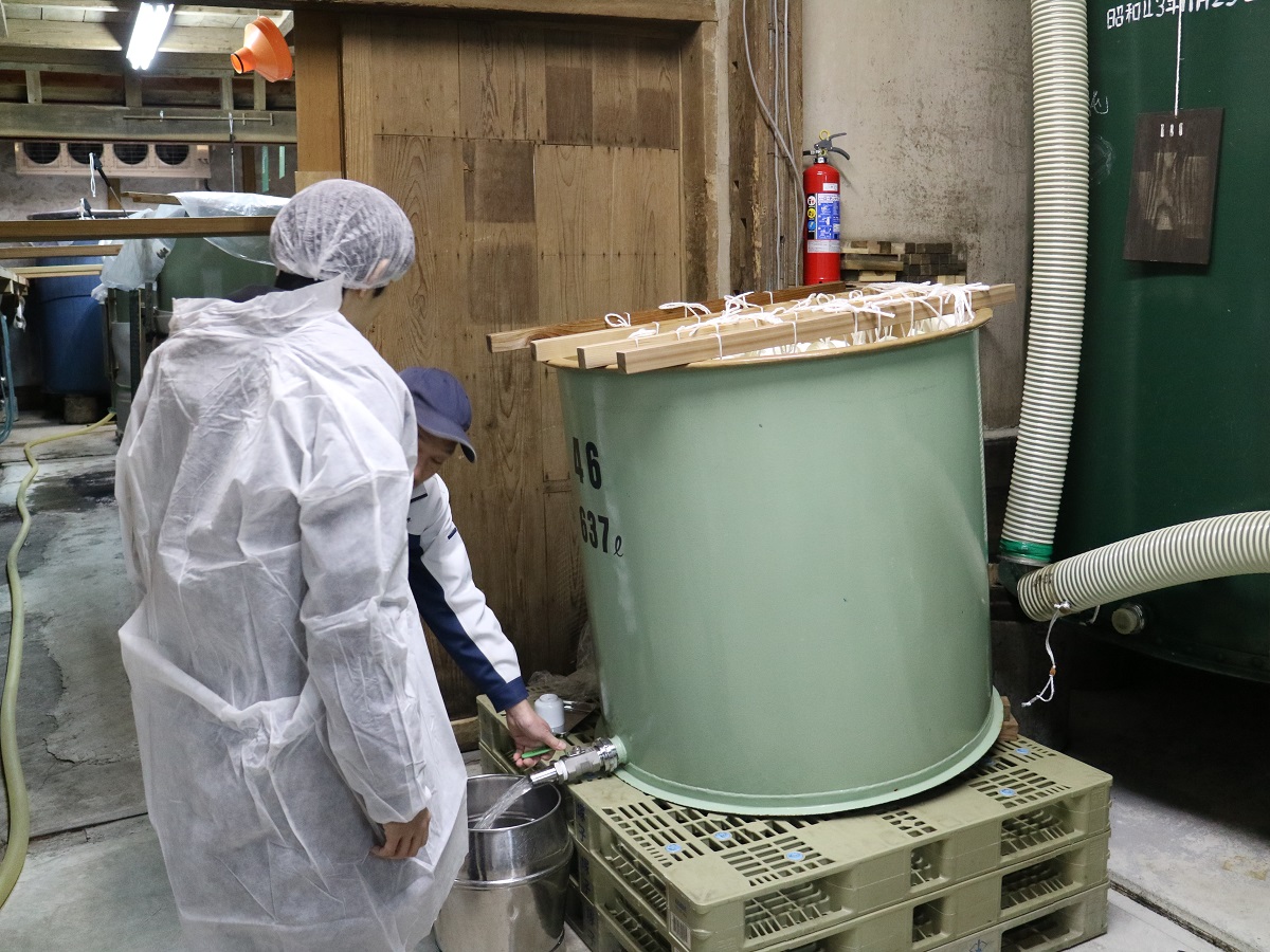 このタンクの中で酒母、麹、蒸米、水をいれ、三段階に分けて仕込みながら「醪(もろみ)」を作ります。酵母が元気に活動してくれる環境をつくるために、ここでも温度管理の徹底や、ベストタイミングでの作業など、旨い酒造りにこだわり続ける職人さんたちの技が光ります。