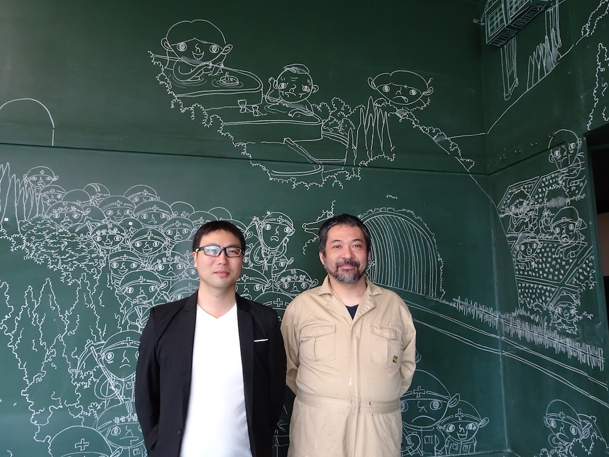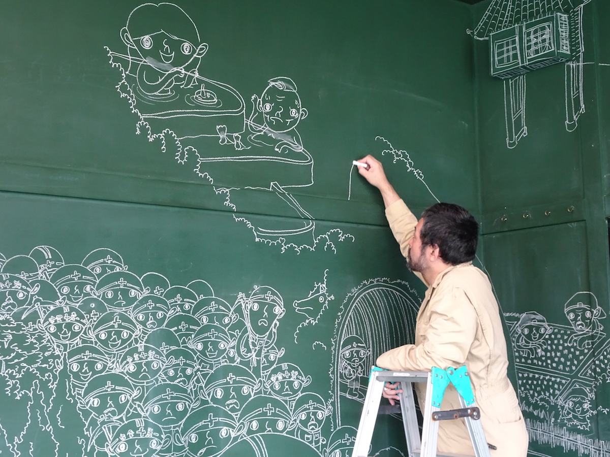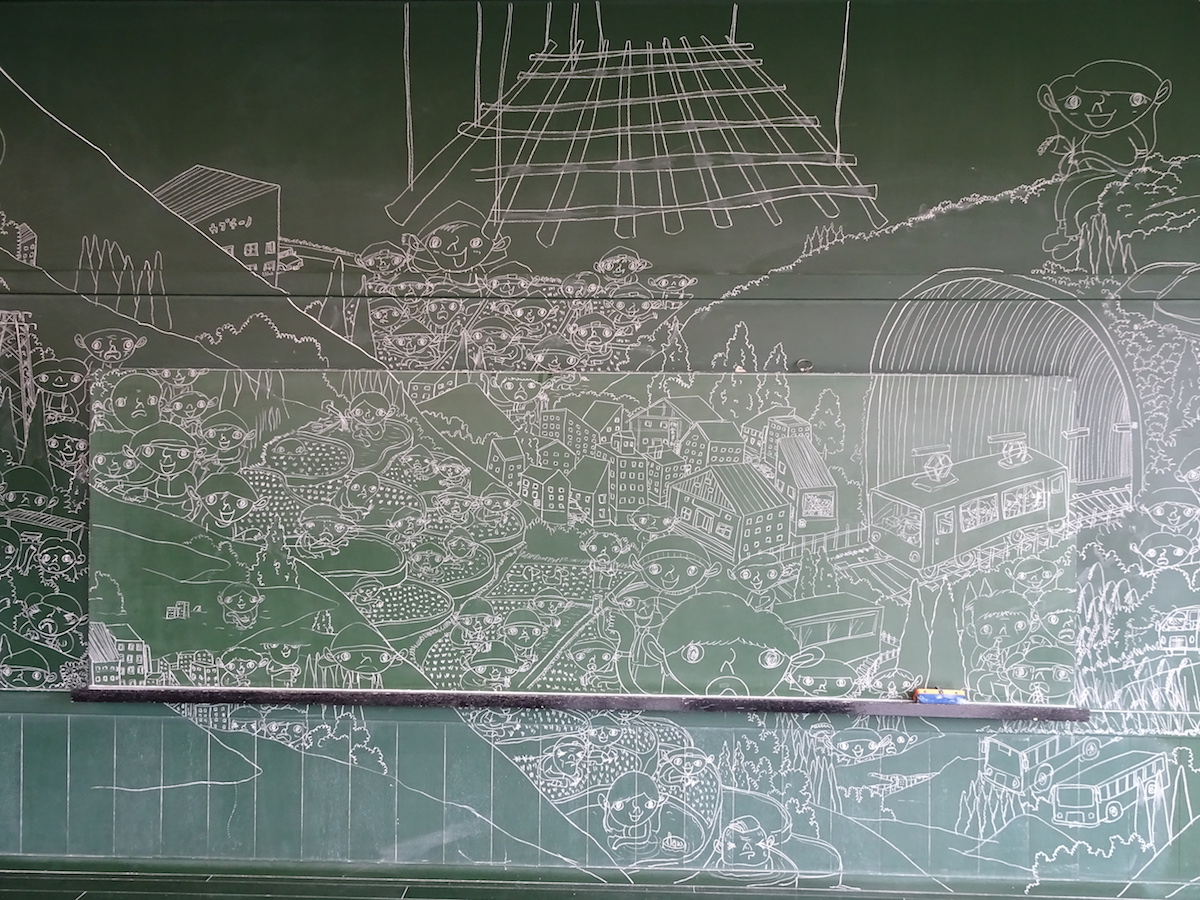 まつだい農舞台の「黒板の教室」にチョークを使ってまつだいを描いていく作品です。