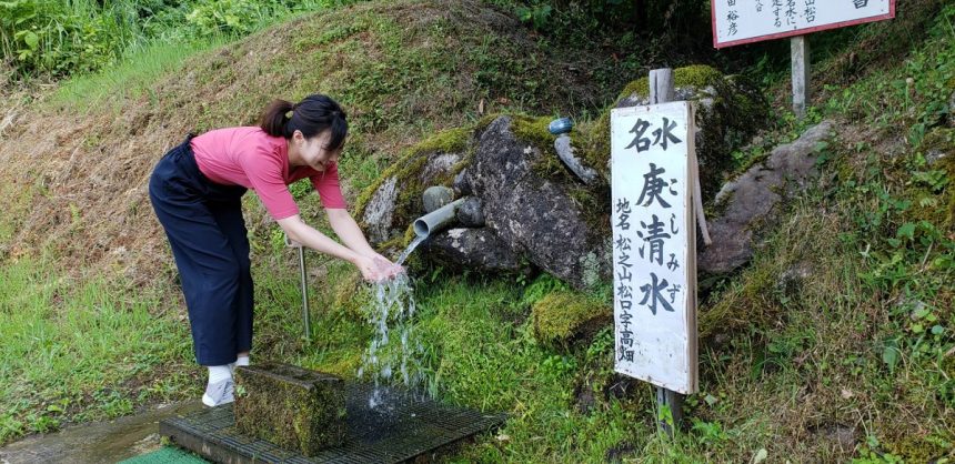 美人林から車で5分ほど松代方面に移動すると「庚清水(こしみず)」があります。こんなディープな場所があったのかと正直驚きました。
