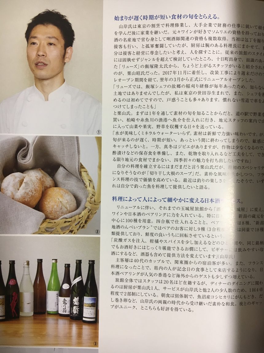 【メディア掲載情報】シェフ/地方のレストランを訪ねて Tweet 【メディア掲載情報】シェフ/地方のレストランを訪ねて シェフ向けの技術知識専門誌『シェフ』120号にて、玉城屋 4代目・山岸の日本酒ペアリングと、料理長・栗山のお料理をご紹介いただきました。素晴らしいページの数々にスタッフ一同、感動です。 ぜひ、お手に取って見てみてください♪ Tweet CategoryPickupBlog in English 【イベント情報:日本酒セミナー】SAKE Tasting in NewYork & Boston【イベント情報:日本酒セミナー】SAKE Tasting in NewYork & Boston なんと、ニューヨークそして、ボストンの2都市で、日本酒セミナーをやることになりました^^ アメリカからメール、そしてお電話もいただき、私でいいのかなという思いもありつつ、 なかなか経験できない機会なので、行ってみることにします! テーマは「日本酒、そして新潟」 これがきっかけに、ニュー…FAQ_English Frequently Asked QuestionsFrequently Asked Questions 【A…Private 【里山十帖】玉城屋スタッフ全員で体験してきました♪【里山十帖】玉城屋スタッフ全員で体験してきました♪ こ…アート 越後妻有里山現在美術館MonET(旧名キナーレ)越後妻有里山現在美術館MonET(旧名キナーレ) …お知らせ 酒の宿 玉城屋酒の宿 玉城屋…その他 繊細で出回れない?!新潟のイチゴブランド「越後姫」摘み繊細で出回れない?!新潟のイチゴブランド「越後姫」摘み」 …ワイン #Repost @yuichi_yamagishi with @use.repost#Repost @yuichi_yamagishi with…周辺観光 にいがた酒の陣NEXT (10月8・9日)チケット完全前売り制!@新潟市万代島多目的広場おおかまにいがた酒の陣NEXT (10月8・9日)チケット完全前売り…日本酒 あべさんあべさん 国内外のゲスト皆様に大人気、あべさんの日本酒🍶 …食 【プレゼント企画】初めて玉城屋をご利用いただくお客様へ〜初めて玉城屋をご利用いただくお客様限定〜 新潟地酒のひとく…館内サービス 冬は雪見露天風呂!雪見露天×日本酒を楽しむ【新潟・松之山温泉】冬は雪見露天風呂!雪見露天×日本酒を楽しむ【新潟・松之山温泉…