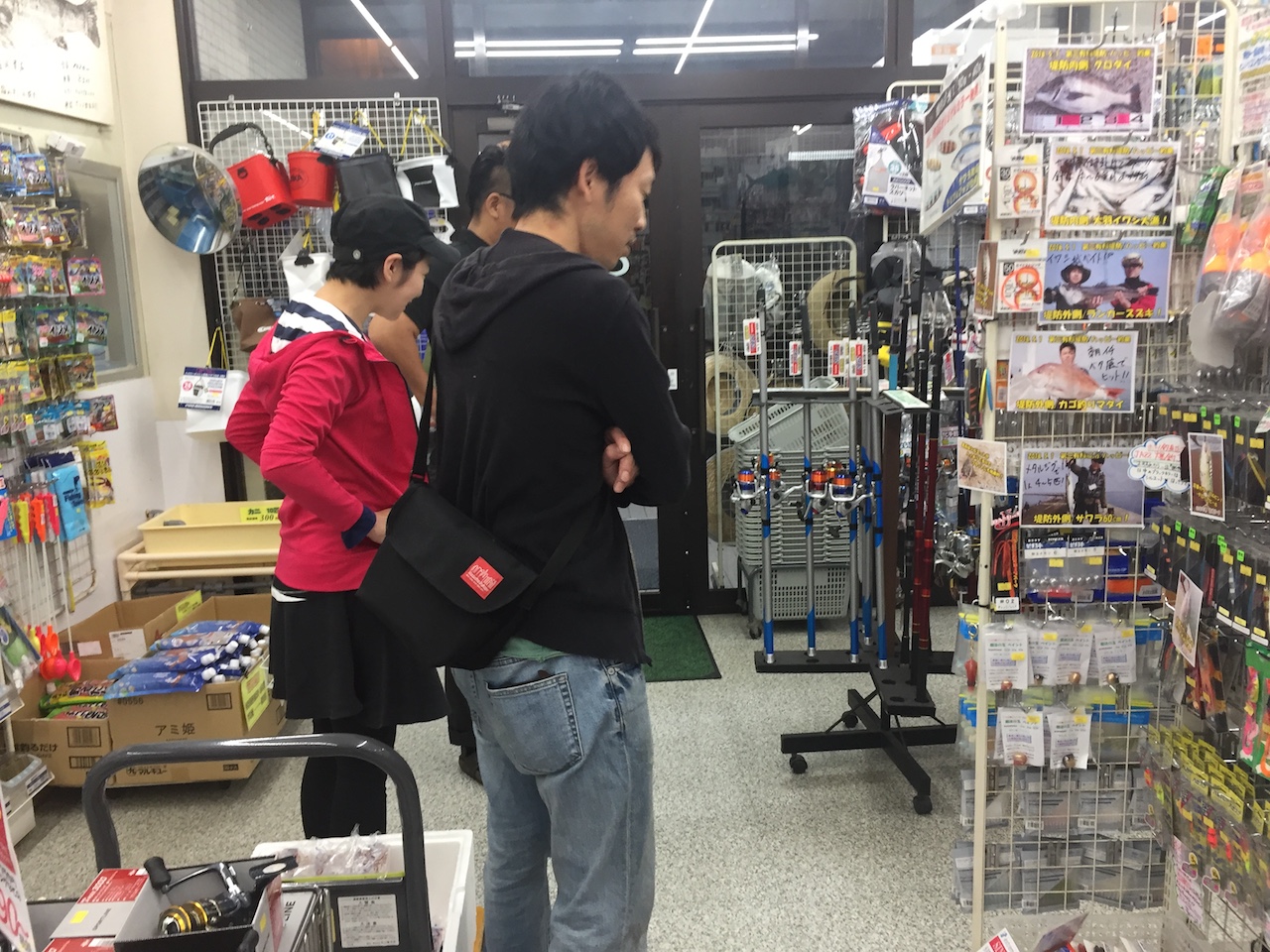 <釣り道具一式を購入する2人の様子>釣り具の店員さんに相談したら、細かくサポートしてくれました。