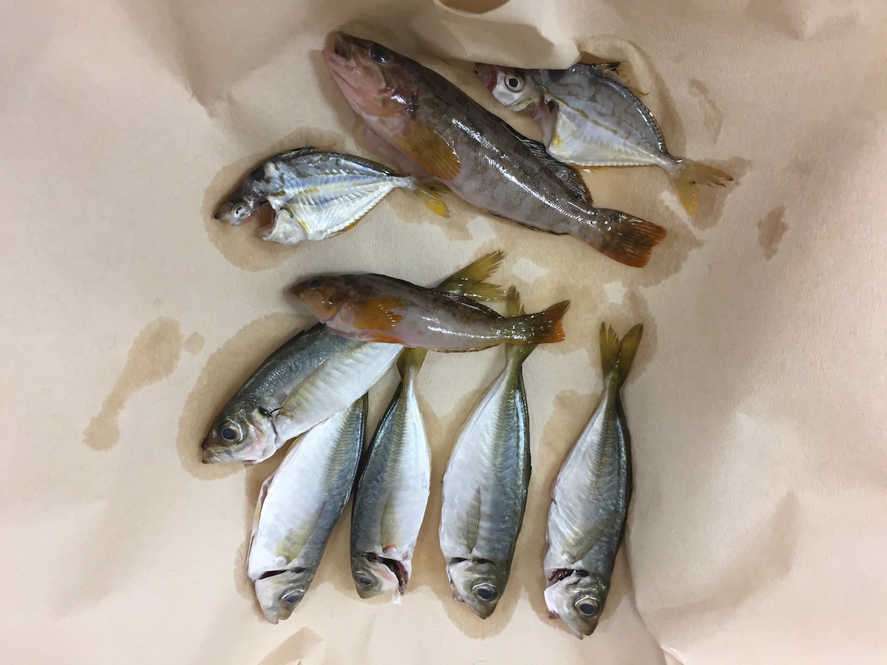 結果、小アジ5匹、アイナメ2匹、ヒイラギ2匹。(井坂さんの魚は魚のエサとなりました。)早起きしたのにな〜。