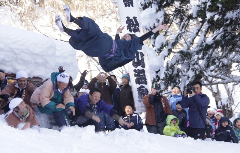 婿投げは前年に結婚したお婿さんを、松之山温泉街の薬師堂から投げ落とす行事。