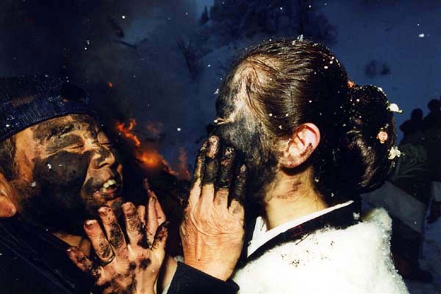 そして、墨塗りは、どんど焼きの灰と雪を混ぜ、お互いの顔に「おめでとう」と言いながら塗りあう、無病息災・家業繁栄を願う小正月行事。