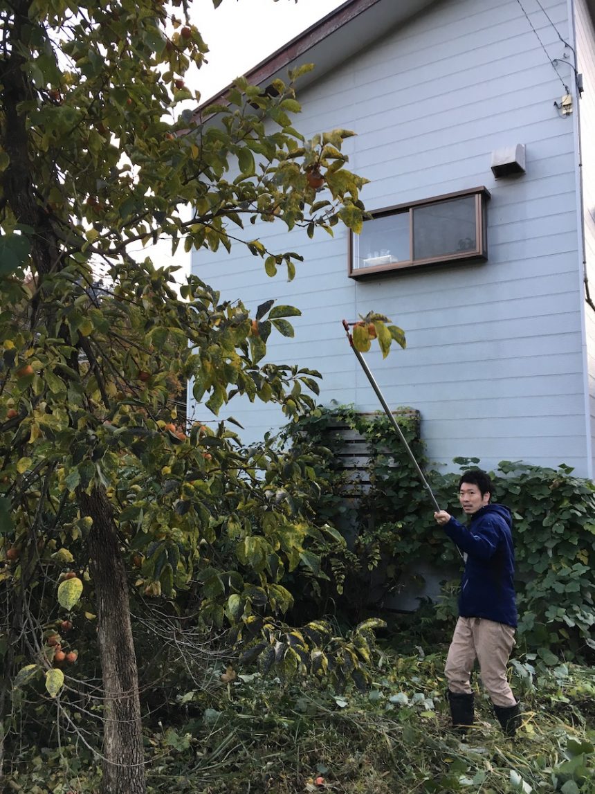 先日のお休みに、柿を採りにいってきました。初めての高枝切りばさみに苦戦気味のシェフ。