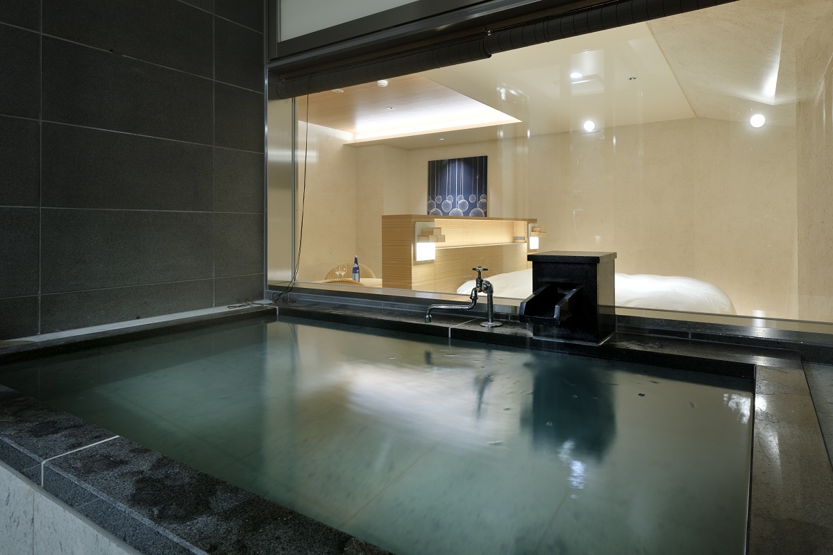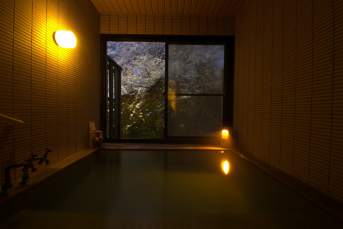 十和田石の浴槽に源泉かけ流しの松之山温泉が楽しめます。
