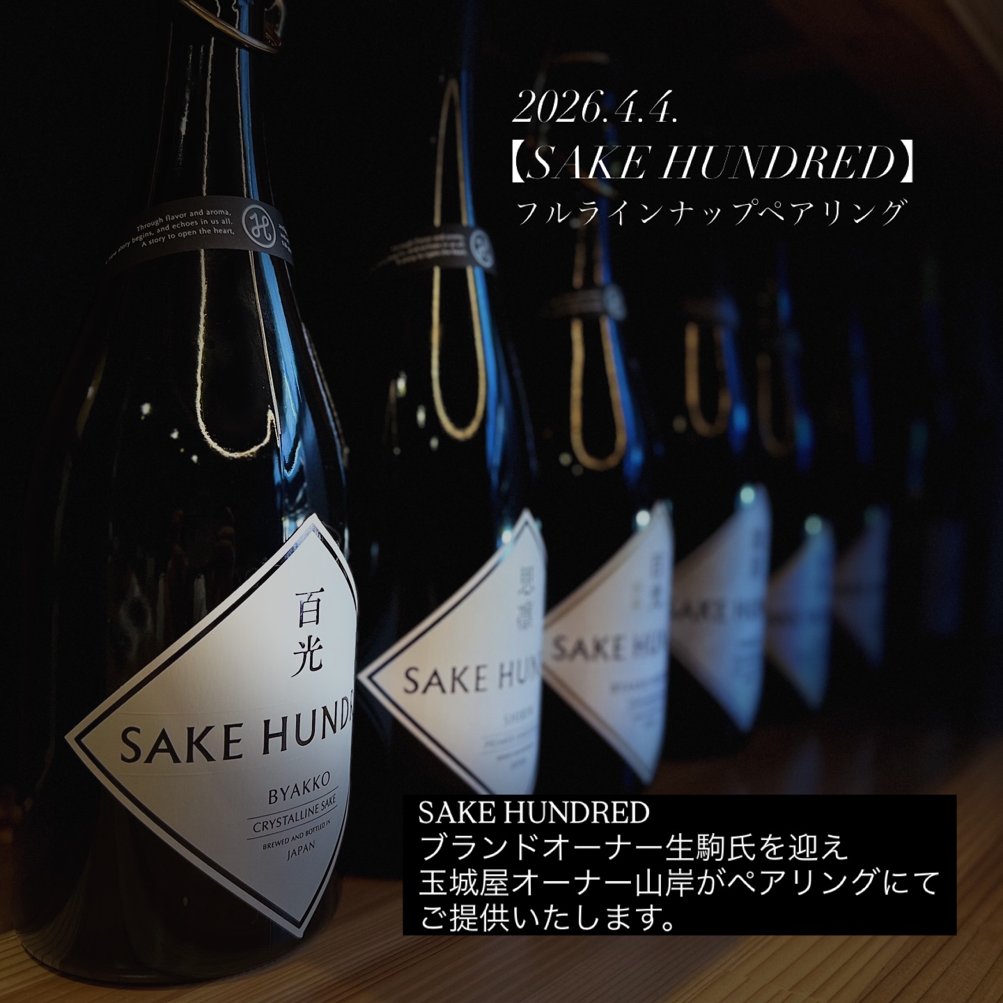 "SAKE HUNDRED"フルラインナップペアリング ------------------------------------------------------- 【SAKE HUNDRED 】ブランドオーナー【生駒氏 】を迎え フラッグシップ「百光」をはじめとしたフルラインナップを玉城屋代表 山岸がペアリングにてご提供いたします。 生駒氏による解説とともに食と酒が響き合う特別なディナーを4/4(土)松之山で開催いたします。 ------------------------------------------------------- ■ BRAND INFORMATION 「SAKE HUNDRED」 “心を満たし、人生を彩る” SAKE HUNDREDは味覚だけでなく心を満たし、人と人との豊かな関係を築いていく世界に誇る日本酒ブランドです。 本イベントでは、各銘柄の物語と純粋な味わいを日本酒の新しい価値として体験していただきます。 ------------------------------------------------------- ■ 提供 SAKE HUNDRED 銘柄   百光|BYAKKO 百光 別誂|BYAKKO BESPOKE 弐光|NIKO 思凛|SHIRIN 白奏|HAKUSO 深星|SHINSEI 天彩|AMAIRO 礼比|RAIHI 15年熟成 現外|GENGAI 30年熟成 ------------------------------------------------------- 日本三大薬湯 松之山温泉 酒の宿 玉城屋 新潟県十日町市松之山温泉13 mail: sakehotel@tamakiya.com TEL:025-596-2057 受付時間:13:00 ~ 17:00 (火・水曜日を除く) #sakehundred #十日町 #松之山温泉 #酒の宿玉城屋