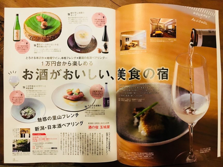 じゃらん酒旅BOOK、”お酒がおいしい、美食の宿”特集で、本格フレンチと新潟地酒が楽しめる宿として玉城屋をご紹介いただきました。