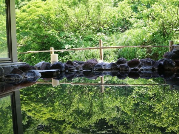 露天風呂の向こうはすぐ山で、春は山菜を見ることができたりも。